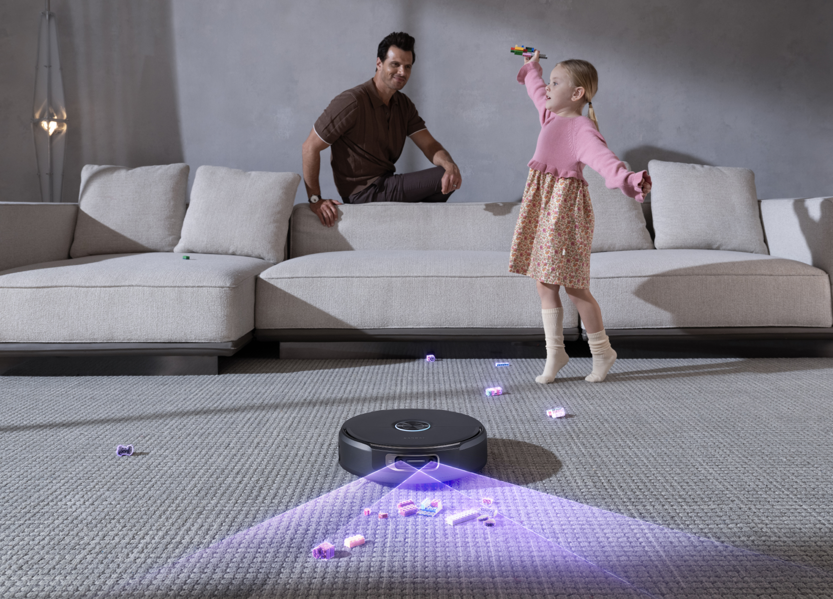 I sensori del pavimento rilevano in tempo reale i cambi di superficie. Il mocio si solleva immediatamente di 12 mm per mantenere asciutti i tappeti durante tutta la pulizia.